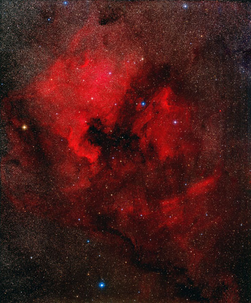 This image shows the North America Nebula (NGC 7000) and the Pelican Nebula (IC 5070, 5067), two nebulae in the constellation Cygnus, approximately 1,700 light-years away. The remarkable shape of the North America nebula (left) resembles that of the continent of North America. To the right is the less luminous Pelican Nebula. The two emission nebulae measure about 50 light-years across and are separated by a dark absorption cloud. It is still unknown which star or stars ionize the red-glowing hydrogen gas.